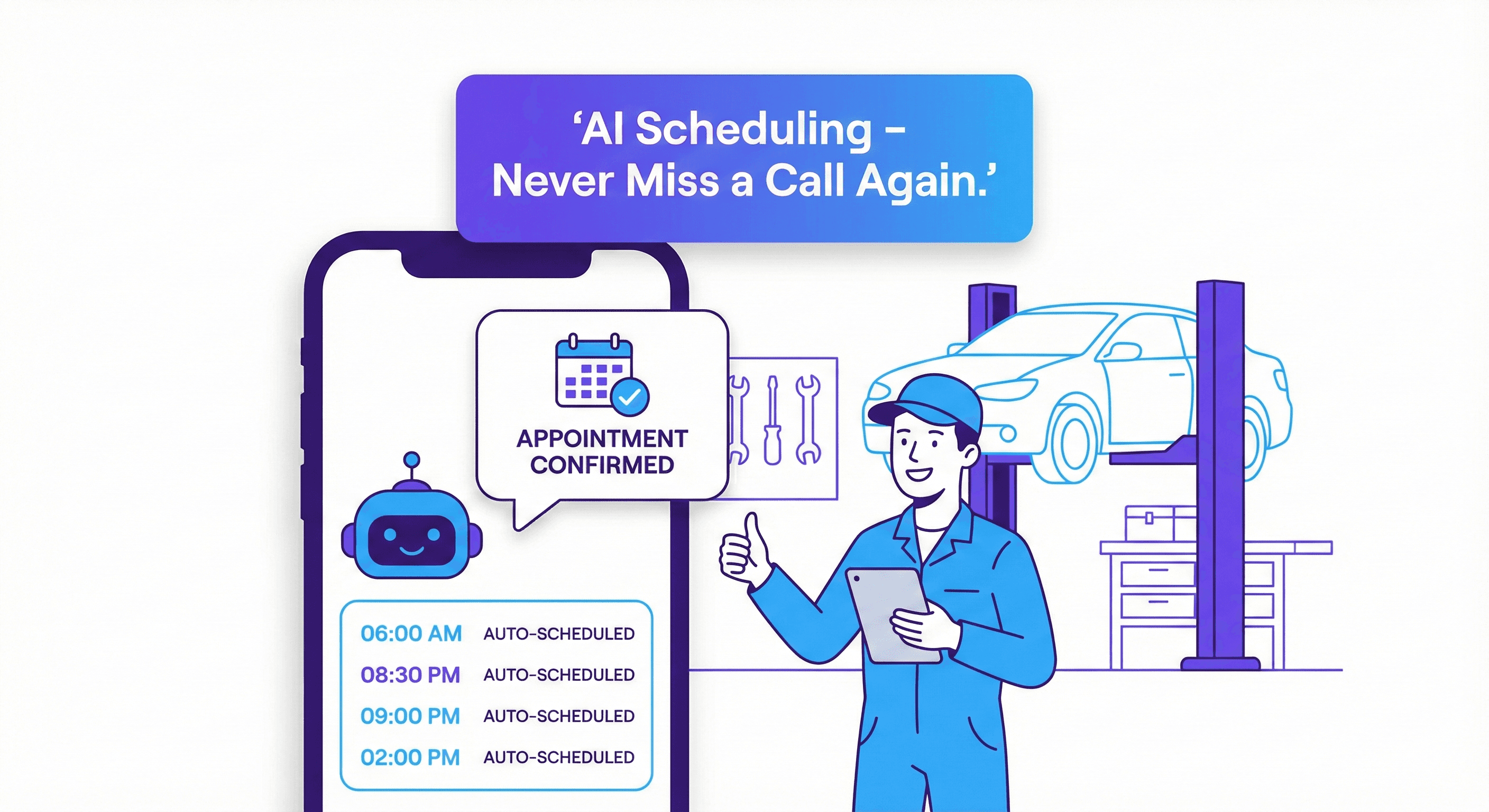 Every time a potential customer calls about an MOT, a tyre quote, or a service booking and gets voicemail, they hang up and call your competitor down the road. This problem is especially acute for busy, independent garages whose staff need to be focused on the workshop, not answering the phone every two minutes.